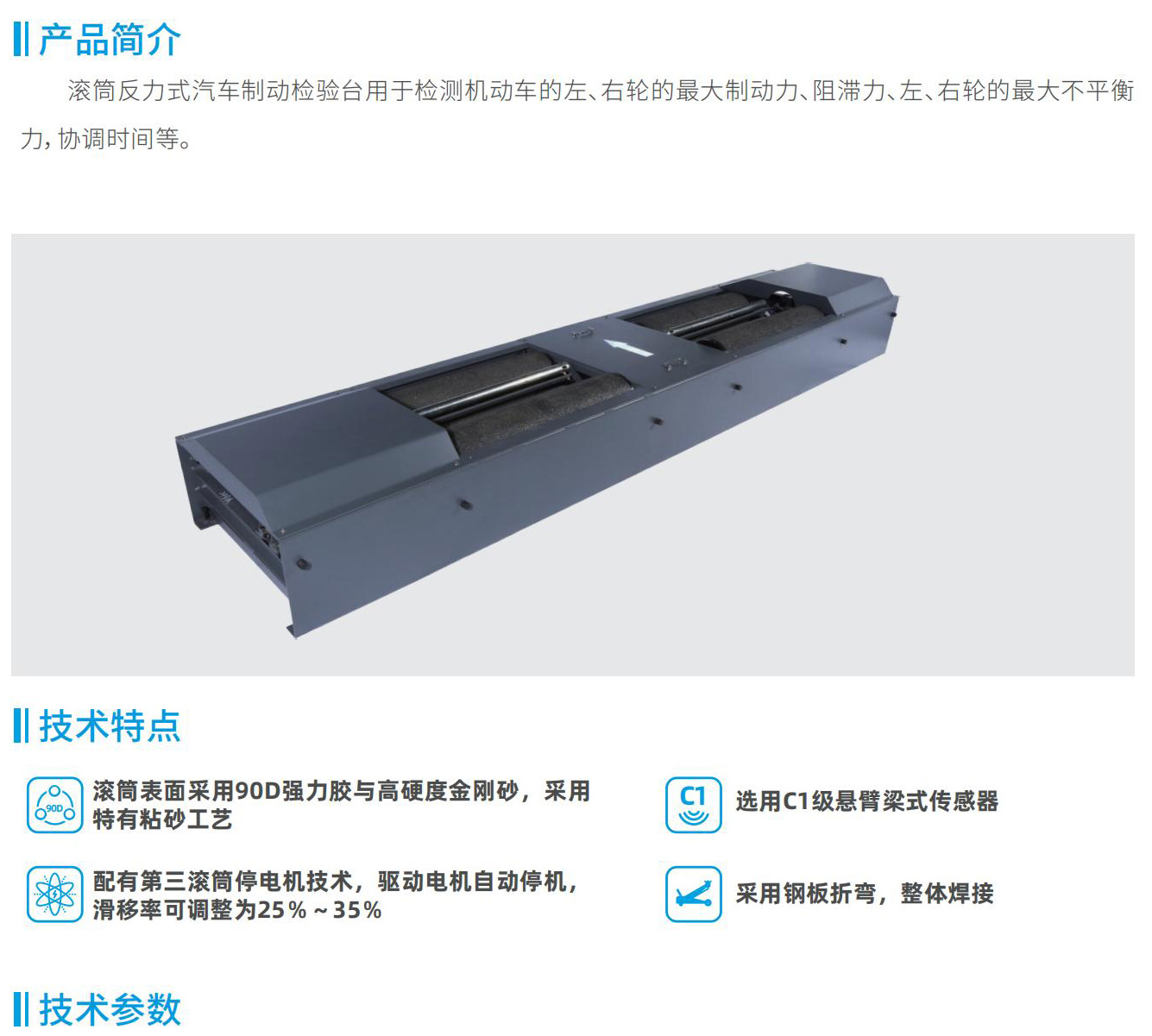 滾筒反力式汽車制動檢驗臺用于檢測機動車的左、右輪的最大制動力、阻滯力、左、右輪的最大不平衡力,協(xié)調時間等。