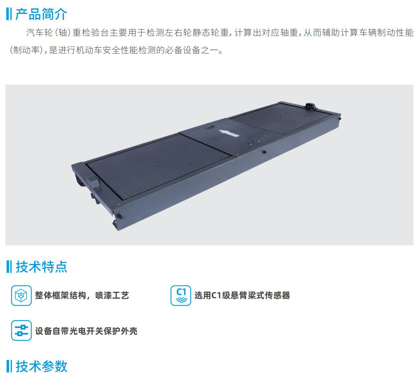 汽車(chē)輪(軸)重檢驗(yàn)臺(tái)主要用于檢測(cè)左右輪靜態(tài)輪重,計(jì)算出對(duì)應(yīng)軸重,從而輔助計(jì)算車(chē)輛制動(dòng)性能(制動(dòng)率),是進(jìn)行機(jī)動(dòng)車(chē)安全性能檢測(cè)的必備設(shè)備之一。